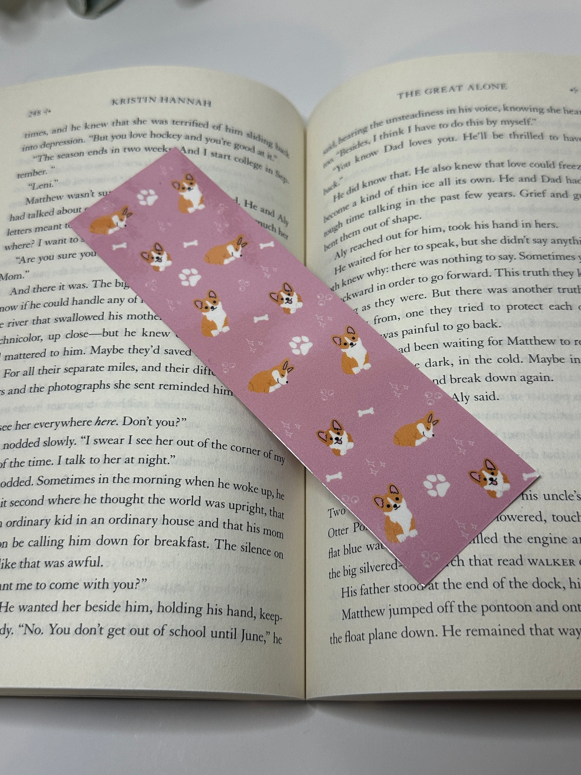 Add a touch of joy to your reading routine with this adorable pink corgi bookmark! Featuring playful corgis, paw prints, and little bones, this design is perfect for dog lovers and bookworms alike. Made with high-quality cardstock and a smooth finish, it’s both sturdy and stylish—keeping your page safe in the cutest way possible.